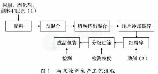 重防腐蝕環(huán)氧粉末涂料的制造方法與傳統(tǒng)液體涂料的制備完全不同,必須使用專用設(shè)備。圖1為粉末涂料生產(chǎn)工藝流程。