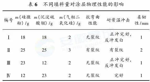 從表6看出,Ⅳ號配方最佳,選擇一定的沉淀硫酸鋇、硅微粉及氣相二氧化硅比例可使涂膜具有較好的綜合性能。