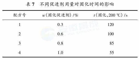 該環氧粉末涂料要求厚涂層一次噴涂成型,為防止流掛,要求涂料具有較低的熔融流動性,容易導致涂層的表面不平整。粉末涂料的流平性受流平助劑、成膜樹脂的結構和固化機理等制約。選用了合適的樹脂及固化劑,具有較高的軟化點和較窄的分子量分布,分子結構較為規整。最終使環氧樹脂與固化劑在高溫固化時具有較低的熔融流動性,不易產生流掛現象,且板面較為平整。通過改變助劑的使用量,可降低涂料水平流動性,能夠起到防流掛的作用。表7是不同固化促進劑用量對固化時間的影響。表8是相關助劑種類、用量及用途。因該環氧粉末涂料較多用在酸堿鹽重腐蝕環境下防腐蝕,故在顏填料及助劑的選擇方面應首先考慮其化學穩定性,良好的耐酸、耐堿、耐溫顏填料及助劑是首選。
