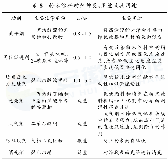(3)助劑的選擇因粉末涂料狀態的特殊性,如要求環氧樹脂和固化劑是容易粉碎和分散的固體粉末或片狀物;粉末涂料的固化反應溫度較高,大多數品種都在180℃左右,所以粉末涂料組成成分受到耐高溫等某些限制,一般在溶劑型和水性涂料中常用的助劑,不能用在粉末涂料中,能用于粉末涂料中的品種就比較少。助劑包括流平劑、固化促進劑、光亮劑、脫氣劑、防結塊劑、消光劑等。其中,流平劑和固化促進劑最為重要。