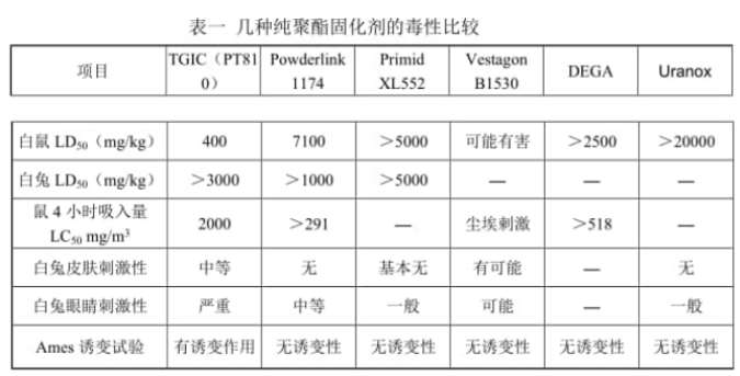 由表一可知,盡管各個純聚酯固化劑都有各自的弱點,但大多數問題并不大。只有作為主要指標的《鼠4小時吸入量》、《白兔皮膚刺激性》、《白兔眼睛刺激性》,TGIC較為嚴重,至少應列入中等毒性的級別。尤其嚴重的是Ames誘變試驗,其它樣品都呈陰性反應,只有TGIC是陽性,說明它有致畸可能。因此歐洲及澳洲在1998年即以發布危險品標志(骷髏)之舉限制它在粉末涂料中的應用﹐我國也已發布從2011年5月1日起禁止TGIC粉末的決定。但一直有人以《此舉將危及6000家企業生存》的謊言來施加壓力,企圖阻止這一法令的實旋??磥碓趪鴥纫嬲龑崿F對TGIC限制,還有待時日。