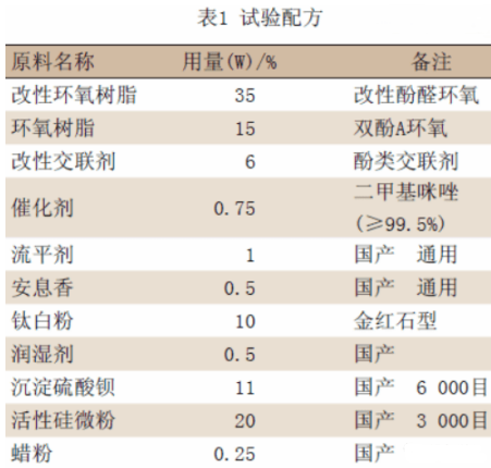 改性重防腐粉末涂料的制粉工藝采用常見的熔融混合擠出法,混合物料通過高溫熔融擠出、壓片冷卻、破碎、研磨破壞、篩分,然后靜電噴涂施工。實驗用配方見表1。