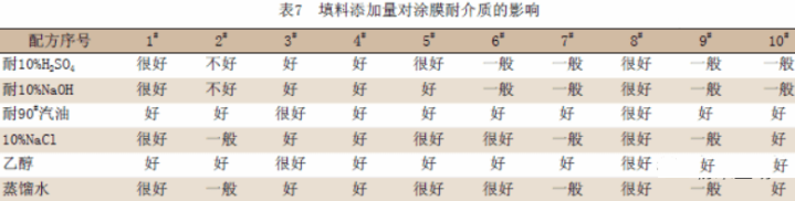 不同的填料進行配方設計如表6所示。填料增加量對涂膜耐介質的影響如表7所示。