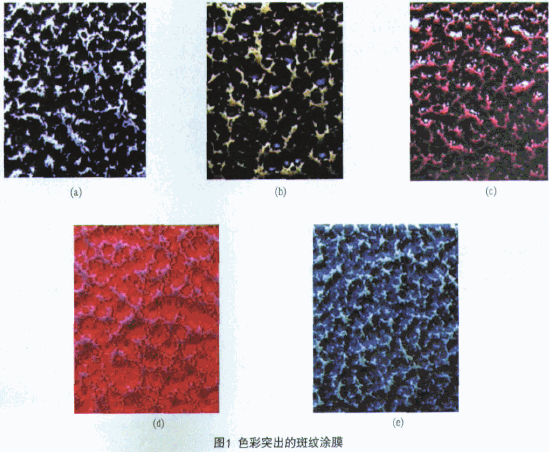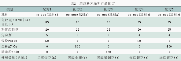 斑紋產品的涂層效果目前有金屬紋理、珠光紋理以及其他色彩紋理幾類(見圖1),其配方組成有基料、斑紋劑和其他功能助劑,再分別添加金屬顏料、珠光顏料或常規顏料;顏料品種可以單一也可以多種調配使用,斑紋色彩可以設計有金色、銀色、仿金屬色、珠光色彩或常規顏色紋理等多種效果。表2是幾類典型的斑紋粉末涂料產品配方。
