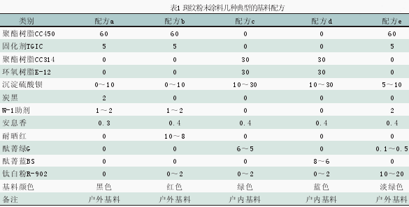 斑紋粉末涂料的基料主要由成膜物質樹脂和固化劑、底色顏料及脫氣劑組成,一般不含通用的流平劑,可以根據材料體系黏度的大小,適量添加填料(如戶內樹脂體系)或使用流動助劑W-1(如戶外樹脂體系)。各種材料的用量與常規粉末涂料產品的要求基本一致,只是為保證斑紋波谷的遮蓋力,顏料用量要成倍增加。由于干混時加入的其他顏料也對涂膜底色產生明顯影響,應根據產品涂膜整體的顏色效果來對基料顏色進行調配。斑紋產品大多采用單一基料,少數也有采用兩種基料的,以減輕斑紋色彩與底色的差異,形成更柔和典雅的裝飾效果,涂料產品基料的典型配方見表1。