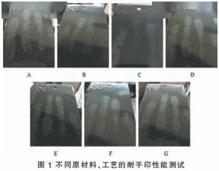 隨后放入130℃烘箱,烘烤12h,然后觀察涂層表面狀態,檢驗其耐手印性能。圖1是A~G系列樣品涂層耐手印性能的測試圖片。