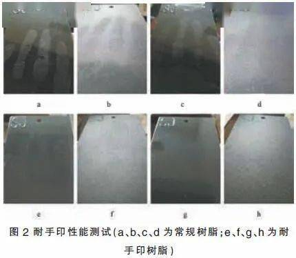 從圖中可以看出,耐手印聚酯樹脂很難看出手印的存在,即便烘烤12h也只存在淺顯手印,擦拭即可清除,而常規樹脂則具有很明顯的手印。