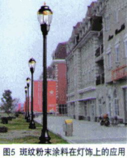 斑紋粉末涂料涂裝可以按普通粉末涂料一樣的加工工藝進行,但為了控制涂膜斑紋效果,涂裝生產中要控制穩定的涂裝工藝,如涂層厚度、固化爐工作參數、懸掛鏈線速度等。當涂裝工藝需要進行明顯調整時,必須及時與粉末涂料的生產技術人員進行溝通,以便其對斑紋粉末涂料配方進行相應的調整,做到批次間涂裝件涂膜紋理色澤的一致性。斑紋粉末涂料以其突出的裝飾效果和對底材良好的遮蓋作用受到了客戶的喜愛,在儀器儀表、燈飾、金屬門窗與家具、工業縫紉機、柵欄、五金工具、各類車輛附件上得到了廣泛的涂裝應用(見圖5)。