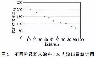 不同粒徑粉末涂料30S內流出量見圖2。從圖可以看出,粉末涂料的粒徑越大,其30s內流出的量越少,即粉末的粒徑越小,粉末的流平性就越好。粉末涂料粒徑為45μm時,粉末涂料30s內流出量為140g
