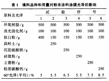 填料對涂料起到消光作用,其原理是填料布滿整個涂膜的表面,破壞了涂膜的平整度,造成粗糙的表面。但不能單純依靠填料對涂料進行消光,只有在填料用量達到臨界體積濃度時,才會有最佳的消光效果。采用相對密度小、懸浮力好的填料(滑石粉)能防止沉降,有一定的消光效果,但這類填料有一定的觸變性能,影響了涂料的流動,難以制得平整的涂膜。只有那些相對密度小、空隙度大、吸油量高的填料(硅藻土、合成二氧化硅)才具有用量小.效果佳的消光效果。除了填料的用量對涂料涂膜的光澤有直接影響外,填料的粒度也影響涂膜的光澤,粒徑越大的填料制得的涂膜光澤越低;反之,光澤越高;同時,填料的粒度分布也影響涂膜的光澤,只有選用粒度分布比較狹窄的填料才能取得較好的消光效果。填料的品種和用量對粉末涂料涂膜光澤的影響見表1。