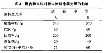 按表4配方制得的A,B2種粉末按照一定的比例加以混合,可制得12% ~40%不同光澤的涂膜。在這一體系中,反應活性的差異越大或引起交聯的溫差越高,所形成的涂膜光澤就越低。但是由于采用這種方法不可能混合得十分均勻,而且不同配比的粉末之間的表面張力也難以達到完全一致,因此涂膜的平整性受到影響,尤其是縮孔等缺陷難以消除。所以,在目前的條件下,大批量投入生產的可能性不大。