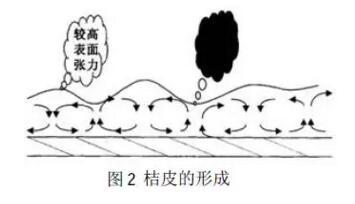 低粘度高表面張力的涂液上升至渦流的周邊(即后來的凸處部位),見圖2桔皮的構(gòu)成。