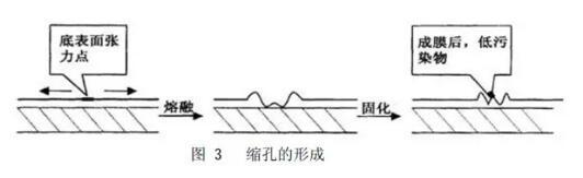如圖3所示,涂膜從低表面張力點流到高表面張力點構(gòu)成縮孔 ,一般低表面張力點或許是加工進程中的塵土、油滴等,也或許是未被充沛濕潤的粉料。