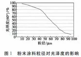 粉末涂料粒徑對(duì)光澤度的影響見圖1。從圖可以看出,當(dāng)粉末涂料粒徑減小,涂層的光澤度則增高,亮光產(chǎn)品的粒徑根本分布在45μm以下;當(dāng)粉末涂料的粒徑過大時(shí),則涂層的外觀功能會(huì)變差,表面呈現(xiàn)氣泡,桔皮現(xiàn)象比較嚴(yán)重。