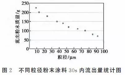 不同粒徑粉末涂料30S內(nèi)流出量見圖2。從圖可以看出,粉末涂料的粒徑越大,其30s內(nèi)流出的量越少,即粉末的粒徑越小,粉末的流平性就越好。粉末涂料粒徑為45μm時(shí),粉末涂料30s內(nèi)流出量為140g。
