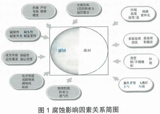 涂層損壞的影響要素許多,這或許遭到包括成膜物質、顏填料、助劑、基材類型、前處理工藝、固化工藝、涂層厚度與涂層附著力在內涂料體系的影響,也或許包括溫度、濕度、細菌與紫外線在內外部環境的影響。所有腐蝕影響要素間的聯系如圖1所示。
