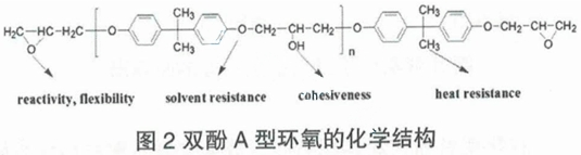 聚氨酯可用于防腐涂料,但價格昂揚;價格合理與防腐功用優異的環氧樹脂,則是個很好的選擇,如圖2所示,就以雙酚A型環氧為例。