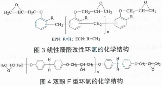 除了雙酚A型環氧,線性酚醛改性環氧與雙酚F型也可用于防腐粉末涂料中,兩者的化學結構圖如圖3與圖4所示。