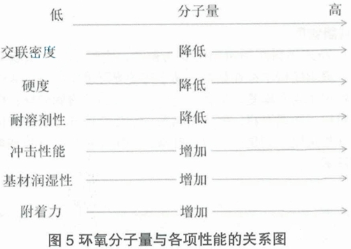 除了化學結構,分子量也是影響環氧各項功用的重要因子,其影響狀況如圖5所示。同高分子量環氧比較,由于低分子量環氧含有更多數目環氧基團,固化后涂層的交聯密度增大,從而涂層的硬度增加,柔韌性與沖擊強度下降。