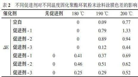 3 種不同促進劑配制的粉末涂料和無促進劑(空白)的粉末涂料分別在180 ℃、190 ℃、200 ℃固化15min,比較涂膜色差(ΔE)的改變情況,其試驗效果見表2。