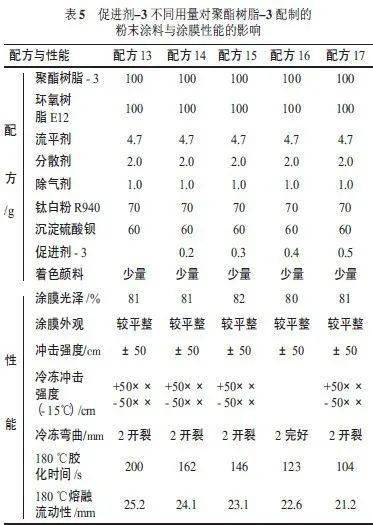 表5 試驗效果說明,跟著配方中促進劑用量的增加,粉末涂料的膠化時間明顯縮短,熔融流動性也明顯變小,但對涂膜的光澤、沖擊強度、冷凍沖擊強度的影響沒有明顯的不同。