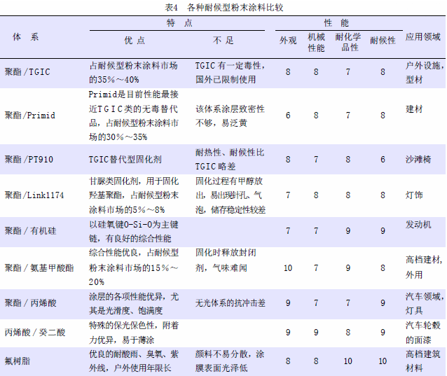 其應用領域越來越廣泛,所占市場份額將會有較大的增加,據2002年世界粉末涂料產量統計,野外類型的粉末涂料占到粉末涂料總量的38.5%。關于各種耐候型粉末涂料,其特色和功能比較見表4。