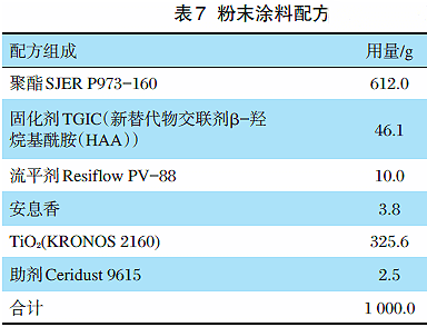 使用實驗室制備的聚酯樹脂,按表7 配方制備了粉末涂料樣品,制粉設備為單螺桿擠出機,擠出溫度80~90 ℃,螺桿轉速200 r/min。