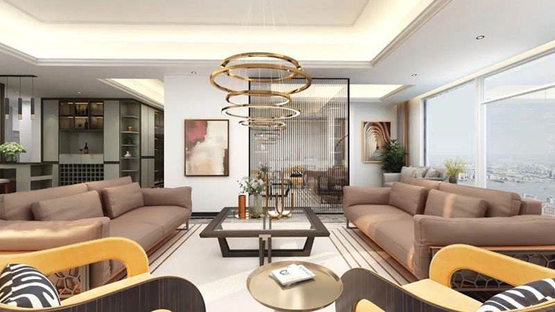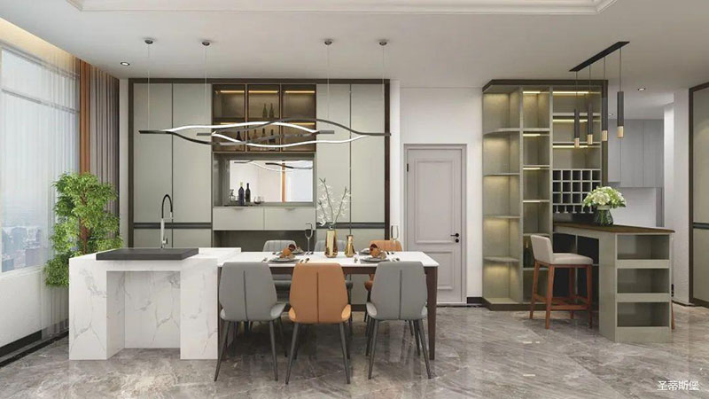 餐廚開放式設計,令空間更為清透明亮。色系一致的餐邊柜,封閉與開放式儲******立又統(tǒng)一,正面鑲嵌玻璃,延伸了視覺空間,僅用簡約線條區(qū)分,將意式極簡形式展現(xiàn)。造型別致的金屬線條燈飾,給整體空間帶來了靈動感。
