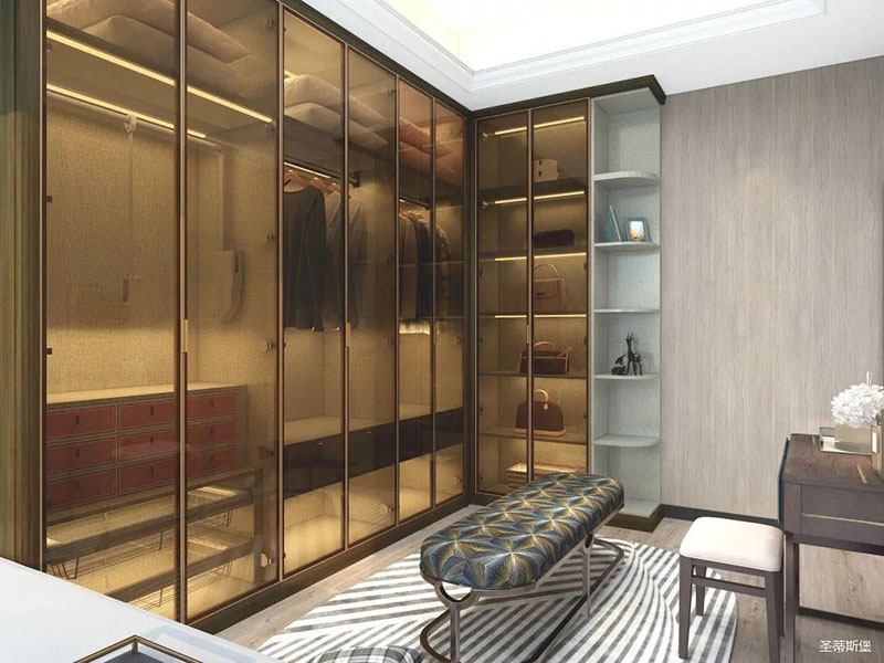 衣帽間開放式置頂設計,在追求簡單到極致的基礎上,給人感官一種簡約整潔的整體感受。打破常規(guī)的空間儲藏方式,脫離一切浮華與不實用,僅用最簡單的線條反映出主人優(yōu)雅的高品味。