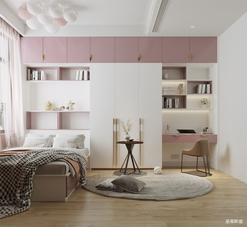 桌柜一體接壤設計,絢麗與沉穩相互襯托,足以達到空間最好的狀態。飽和又柔潤的色塊,整齊坐落于床體柜身,通過極簡規劃分配,刻畫出完美的實木紋理。造型獨特的床前燈,像一抹陽光照進心扉,散發著童真與夢幻的味道,形成了獨有的輕奢精致感。
