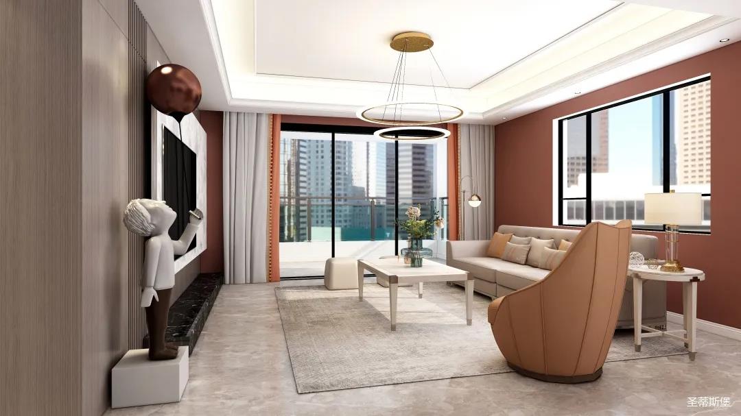 表姐不喜歡大白墻設計,于是設計師完美貼合表姐的喜好,摒棄了傳統的大白墻,將色彩跳躍的鐵銹紅應用于空間,從視覺上豐富了空間的層次感。南北通透的空間布局,讓視野更為清透明亮。