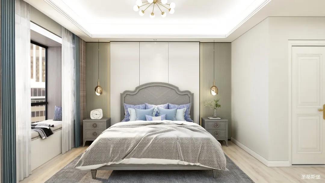 次臥的設計充滿治愈氣息,表姐打算讓兩位老人居住。莫蘭迪灰的實木感經典再現,沉穩中透著時尚,流露出精致的美式格調。舍棄刻意繁復的設計,簡約米白背景墻與床屏產生的視覺延伸,提升了空間的舒展性。金屬材質的燈飾,以較強的白熾燈為主,輔助照明,將對兩位老人的關愛體現在細節中。