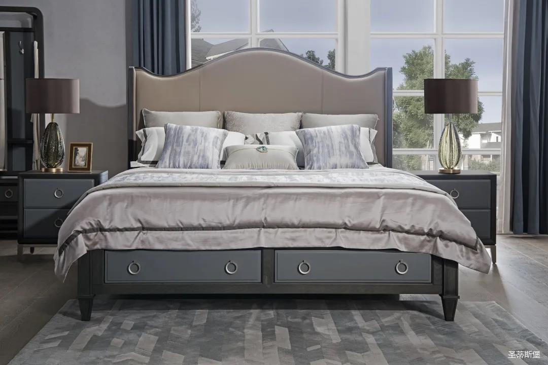 客廳延續著美式輕奢的氣韻,背景墻被簡約有序的金屬線條分割,營造出質感空間的細膩。沙發沉穩又不失時尚,色彩混搭更是讓人耳目一新,展現著美式風格天性自由不羈的浪漫個性。