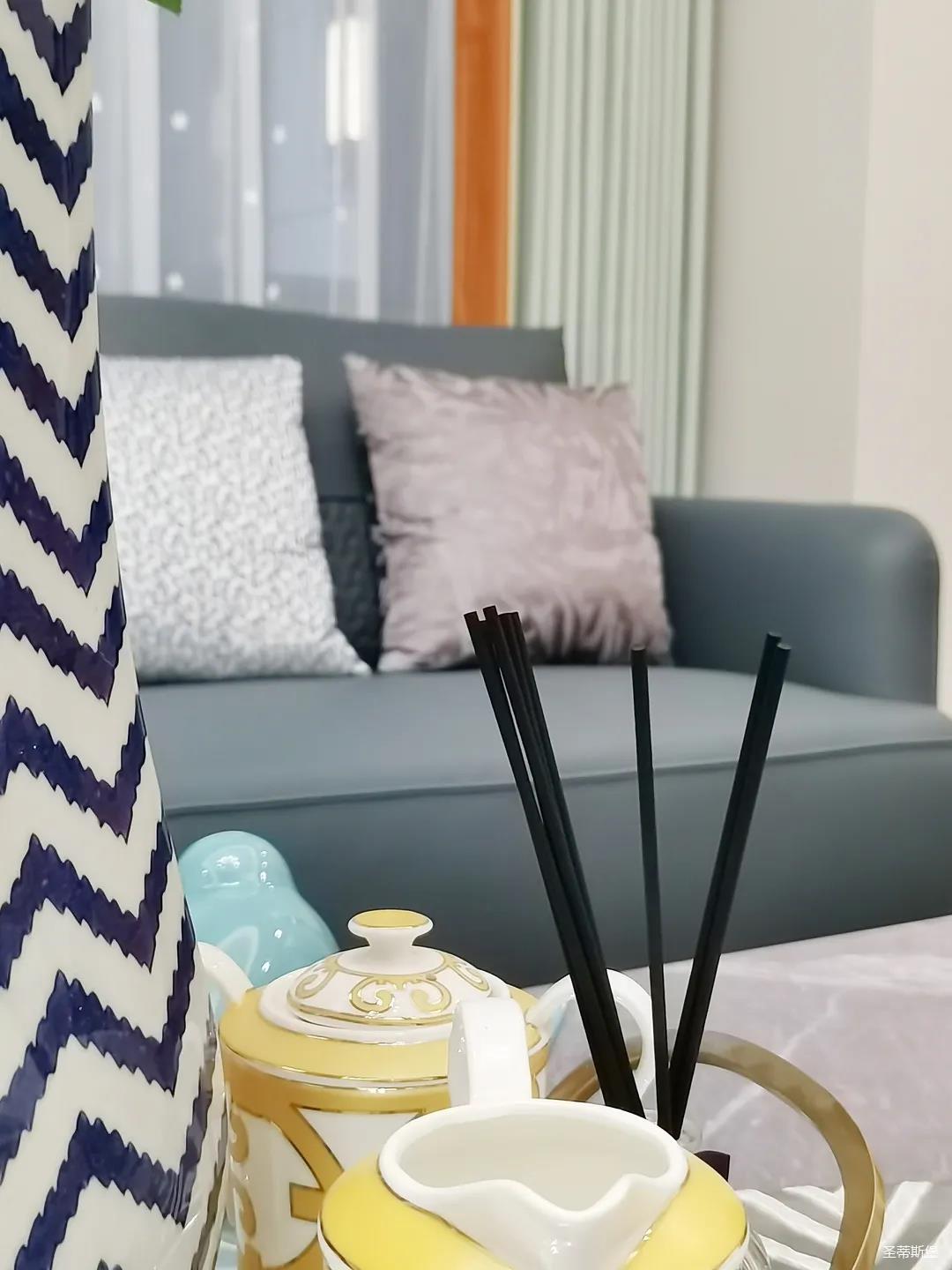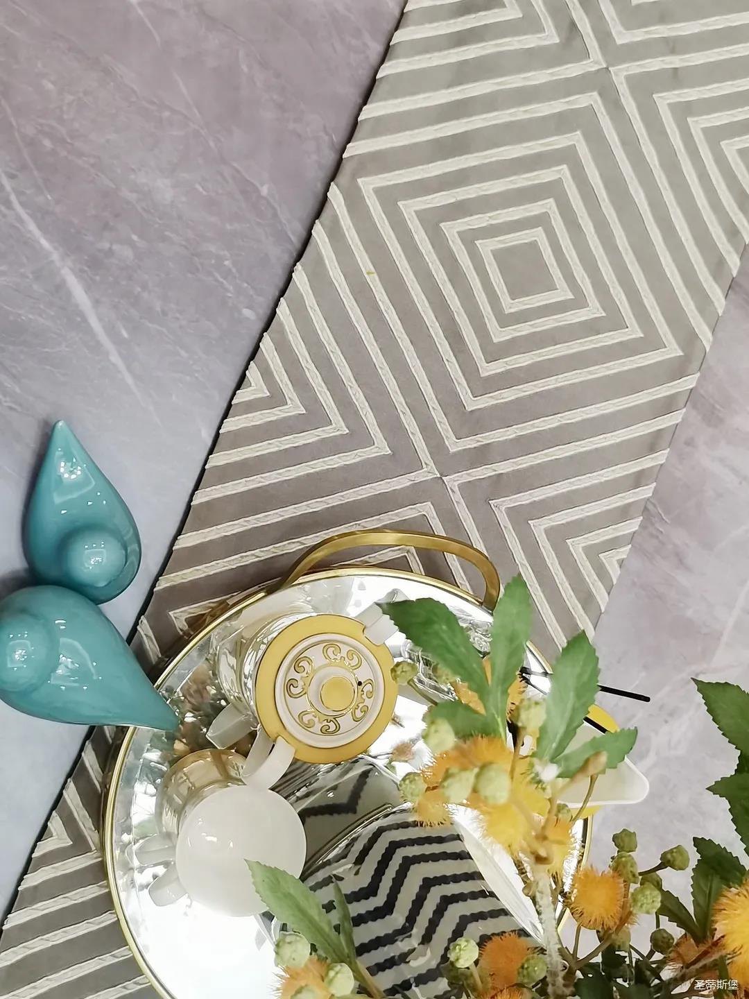 淺灰為基底的飾面與低飽和度的深色沙發相互映襯,產生強烈的視覺沖擊,深色的家具讓空間從視覺上衍生出一種縱深感。巖玻的質感與真皮編織的紋理盡顯現代之美,細節陶瓷擺件注滿了空間優雅的藝術氛圍。