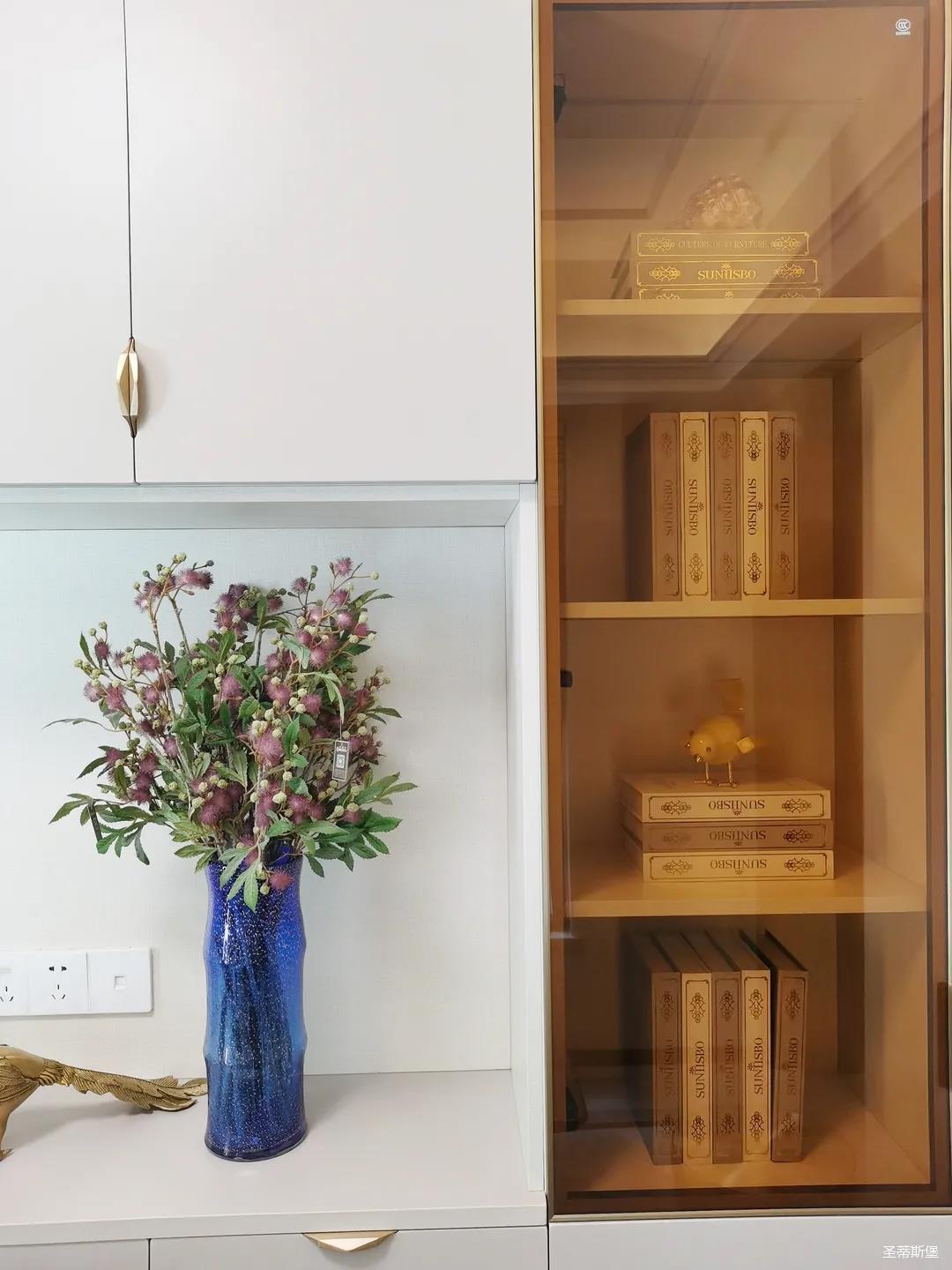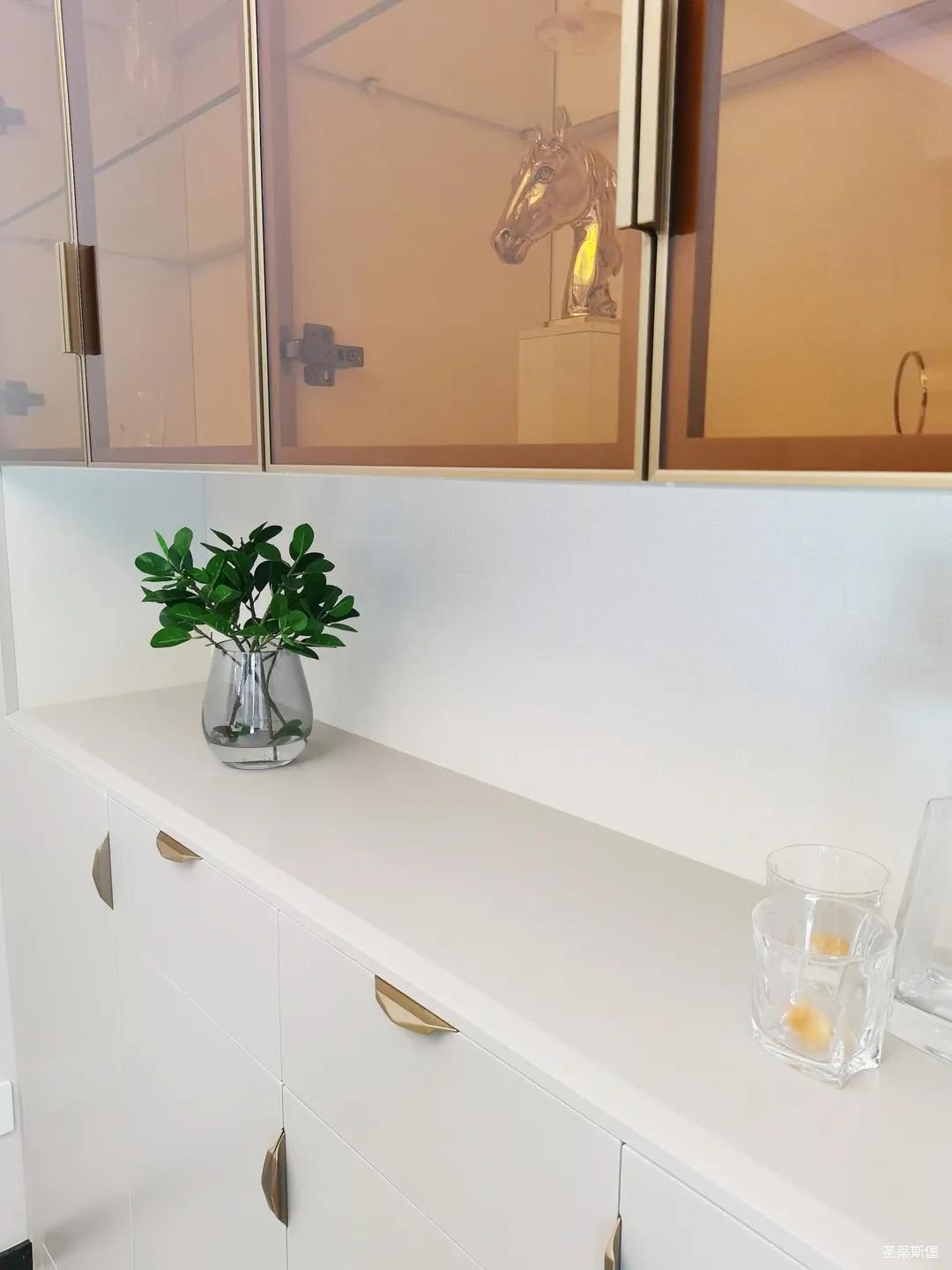 開放式的餐廚設計讓餐邊柜和櫥柜的居家動線更為流暢,成了最便利的收納場所,生活小資而又美好。