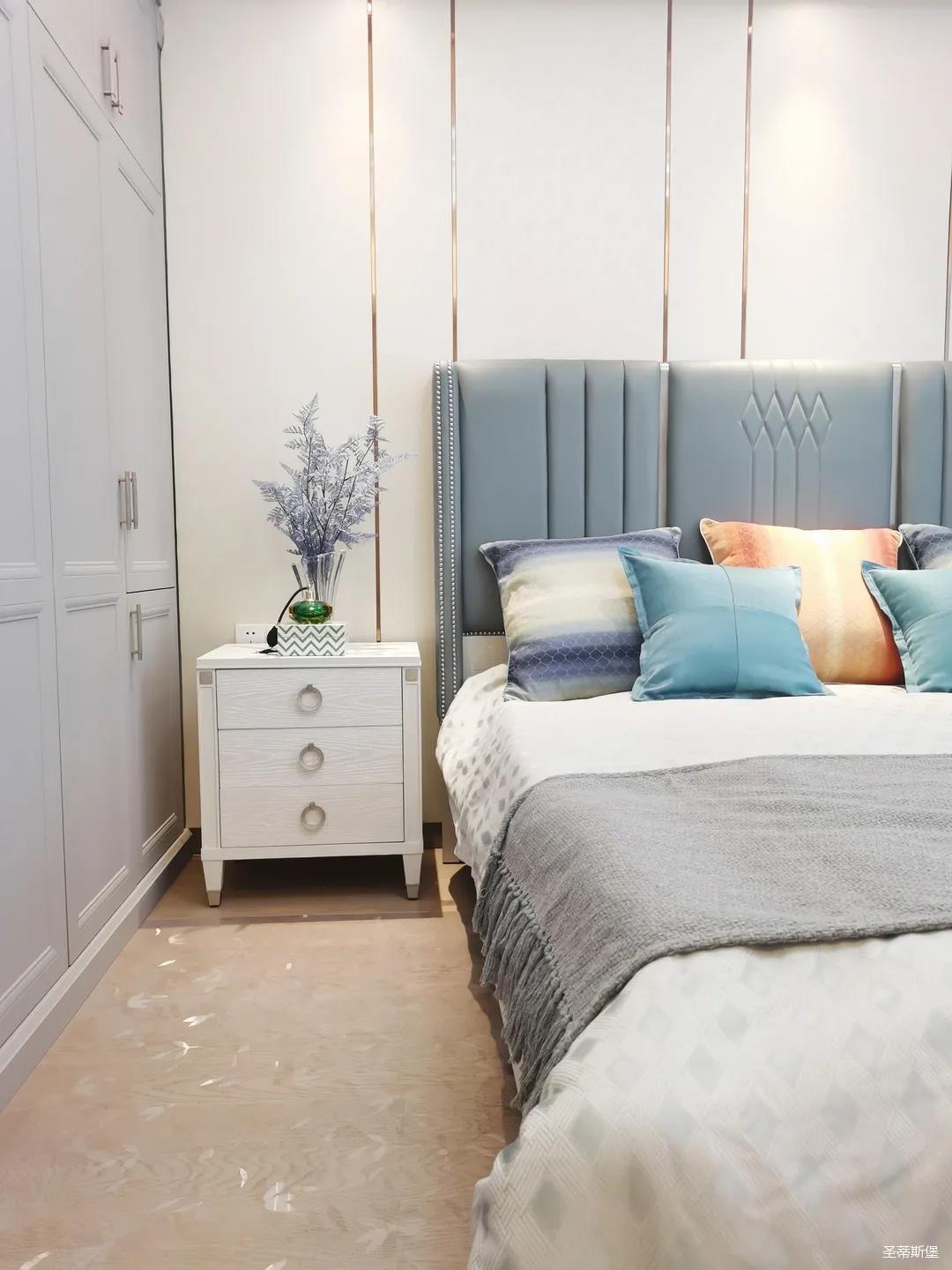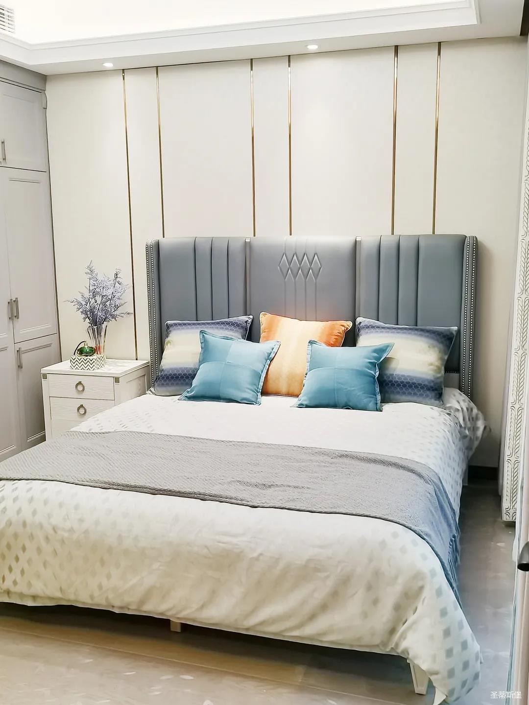 一樓的房間業主是作為長輩房,采用輕奢的背景墻面,結合亮眼的金屬線條設計,空間顯得時尚又不失沉穩。莫蘭迪色的淺藍床屏,在無主燈設計與自然光線的碰撞下醞釀出不同的光影美感。