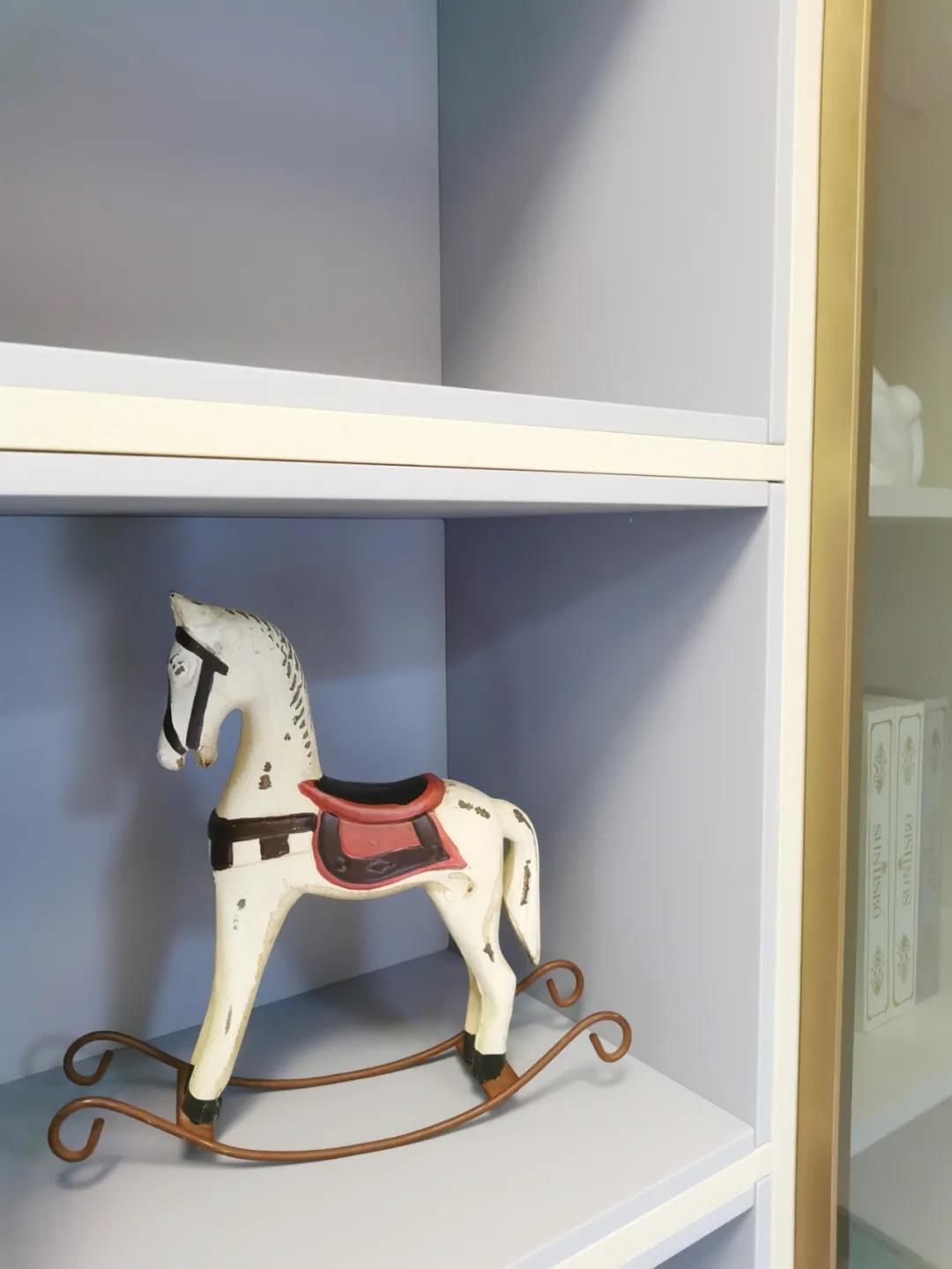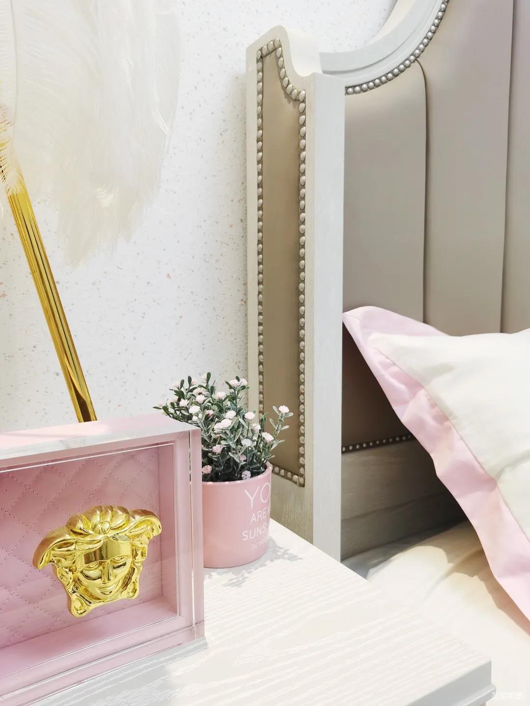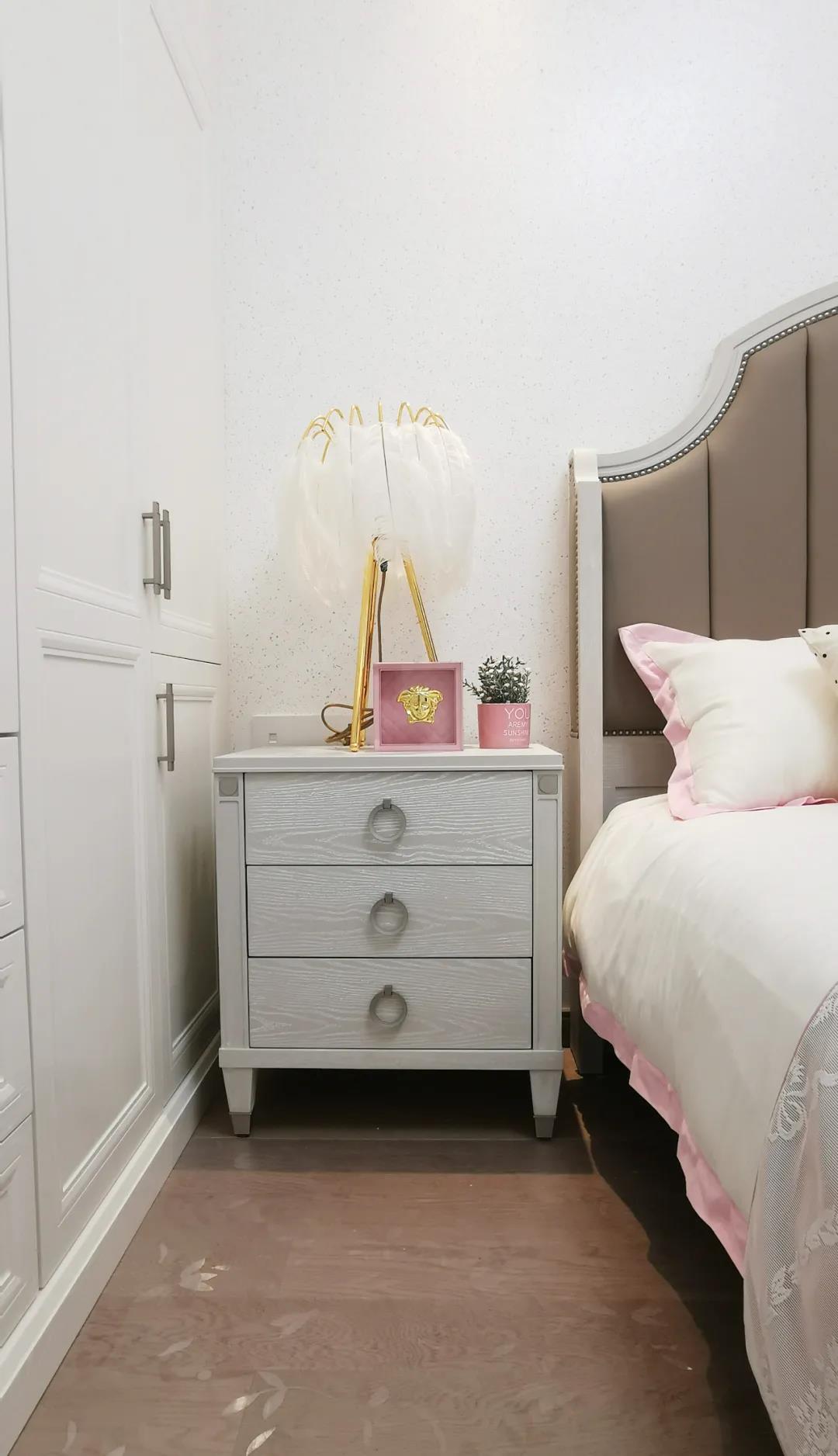 少女粉軟包床屏搭配仙氣十足的羽翼臺燈,讓空間顯得尤為夢幻。功能與顏值兼具的定制衣柜,與溫柔的空間相得益彰,簡單優雅的同時也不失童趣。