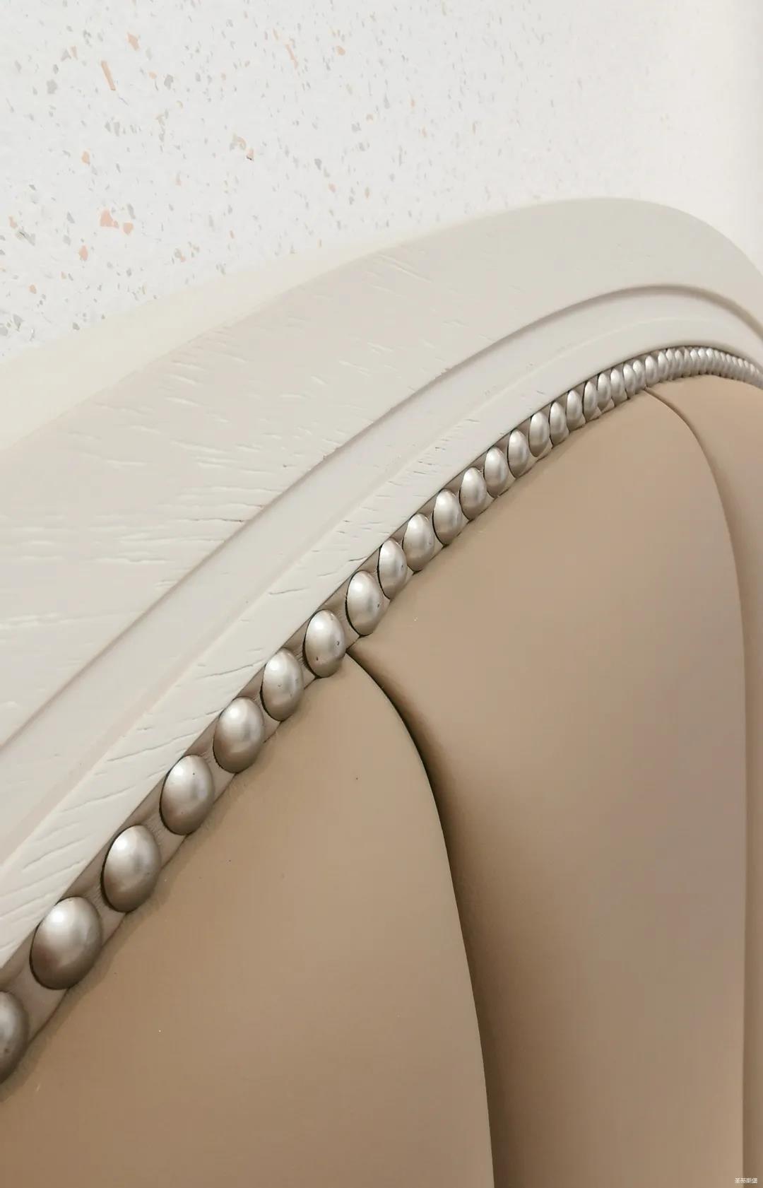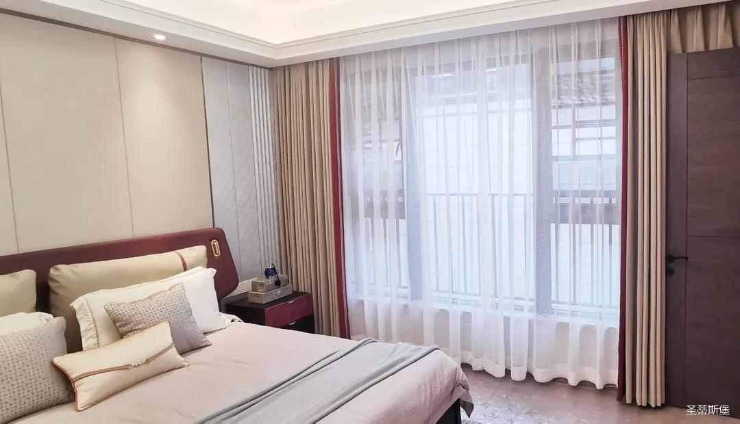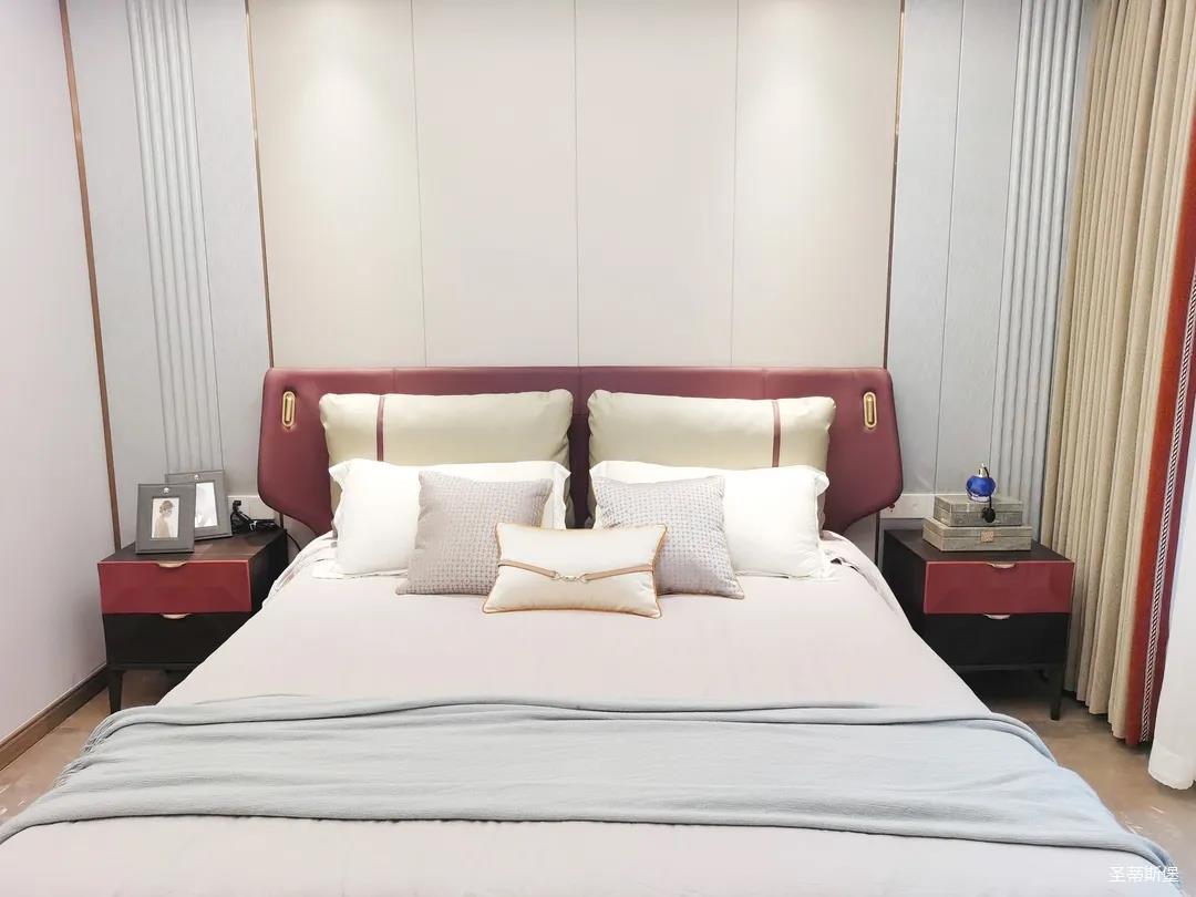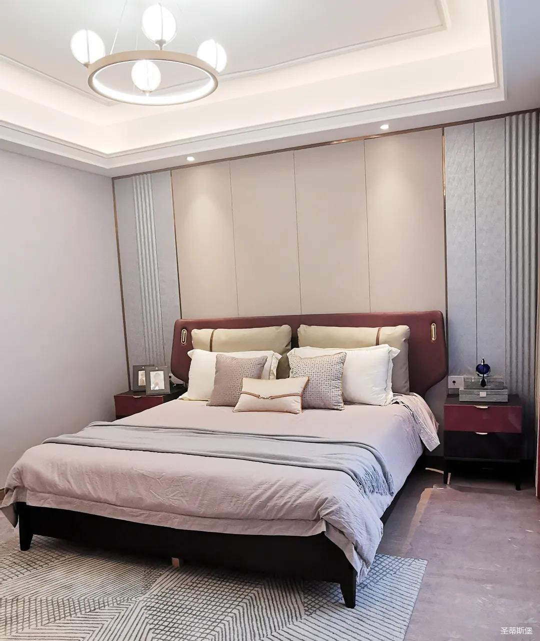 三樓的主人房設計風格更偏向簡約,浪漫的酒紅色床屏運用了曲面造型,融合了極簡主義美學和輕奢元素,小型夜間感應燈設計讓每一處細節都充滿著時尚優雅的氣息。夜間倚靠在厚實的軟包上,時光好像在不知不覺中慢了下來,讓我們能品味和咀嚼生活的氛圍。