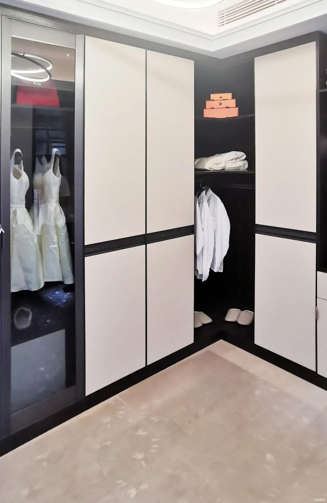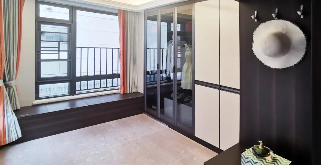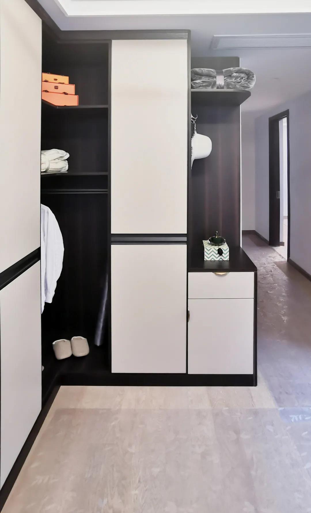 衣帽間以現代極簡設計手法引入輕奢元素,借助實木與金屬組合打破了傳統儲物區的沉悶感,煙熏色橡木紋的定制柜體,色澤好似一杯溫暖醇香的摩卡,令空間層次感與立體感的格調頓生,予以沉穩舒適感官體驗。