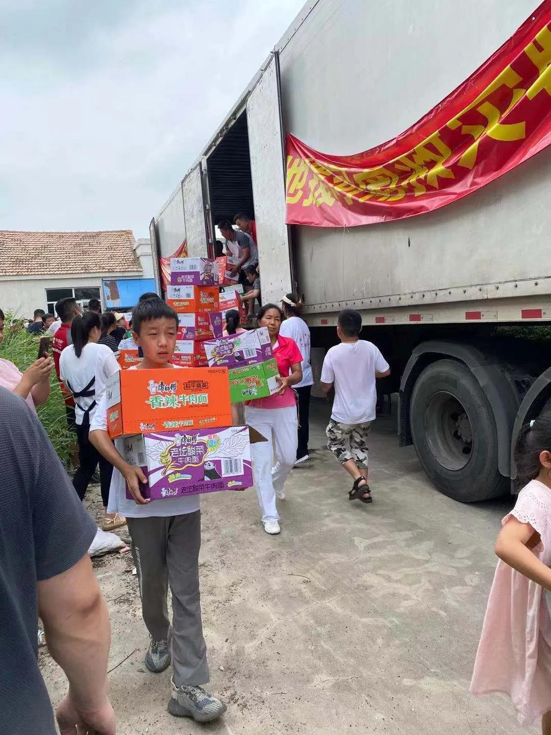 一輛滿載純凈水和食品等抗洪救災(zāi)物資的卡車,