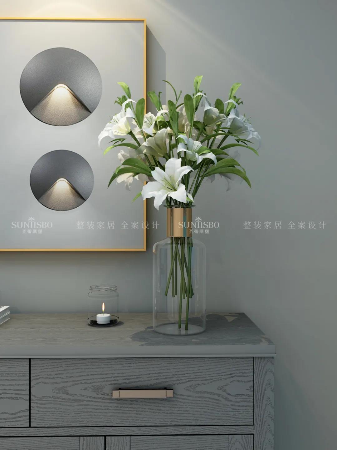 入戶側面設計一字型玄關,腰部,底部留空做層板,便于隨手放置鑰匙、鞋包等物品,中間留空設計為開放展示區,加上軟裝飾品點綴,達到業主對品質生活追求的理想狀態。應女主人要求,玄關還加長延伸出妝鏡和換鞋凳,讓動線自然流暢。