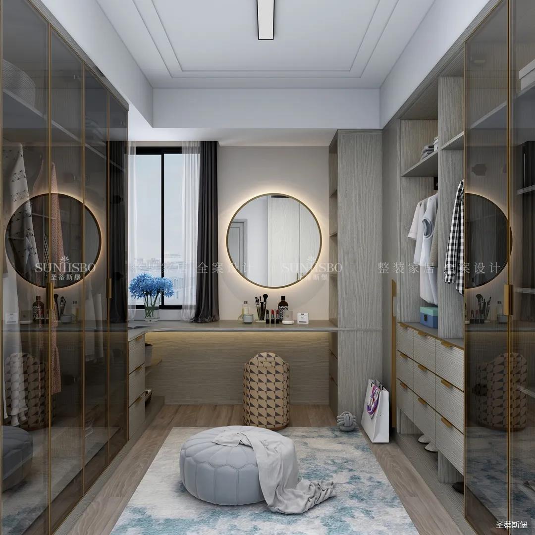 進入玄關區域就能感受到房主對時尚風格的偏愛,實木元素與簡奢金屬的碰撞,既有對材質的甄選,又有現代簡奢的品質感。穿衣鏡、換鞋凳、收納柜等藏漏有序的分區,將屋主的生活歸納的井井有條。