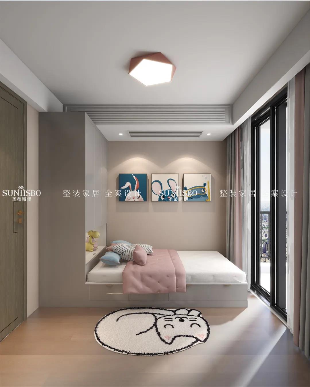 在設(shè)計之前,業(yè)主就預(yù)留了寶寶房,寶寶房實用又溫馨,榻榻米床可以做收納柜使用,收納寶寶的換季衣服、玩具等。在色彩上搭配也是采用的莫蘭迪色系。這樣的兒童房誰能不愛呢?