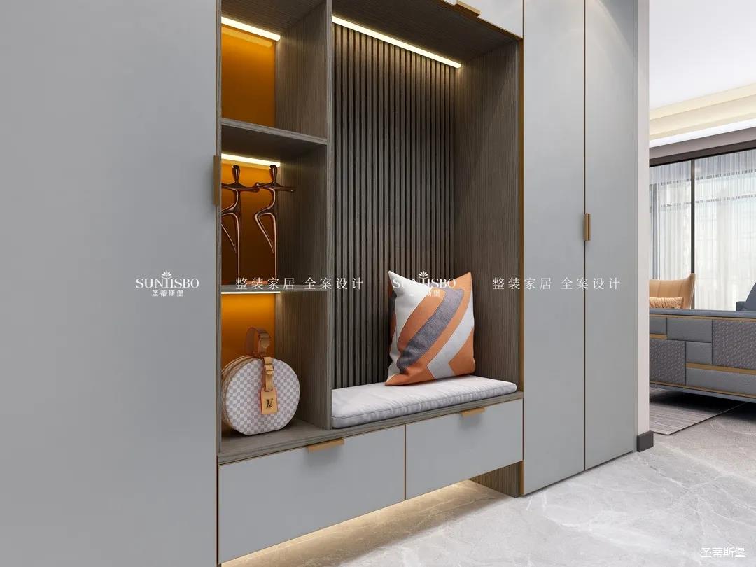 開門即見寬敞實用的玄關柜體。暖黃色的燈帶,不僅增加了室內環境的層次感,更是創造了隱形的光環境。