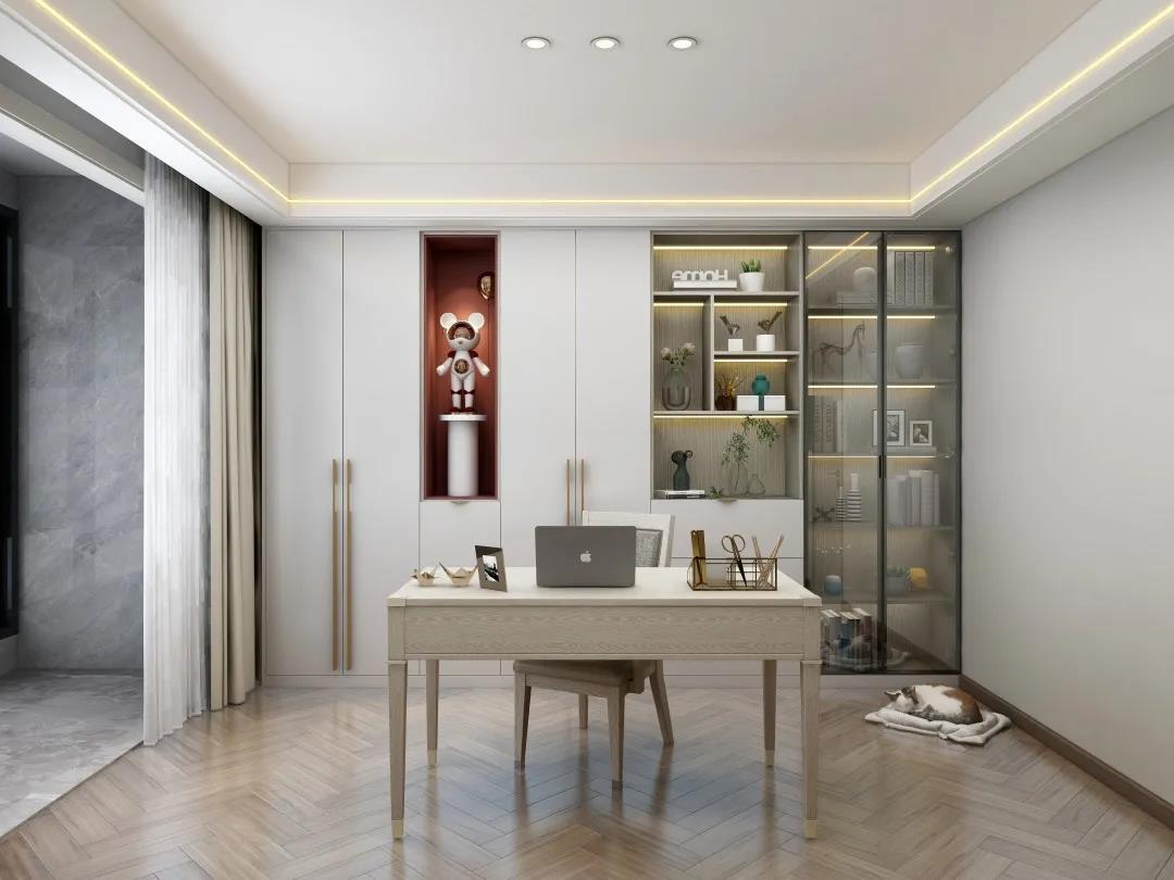 書柜以虛實結合的體塊感呈現,疏密不一,相異的色調在橫縱間碰撞交錯,演繹靈動隨性之美,踱入書房,這一隅是閱讀、辦公最好的場所。
