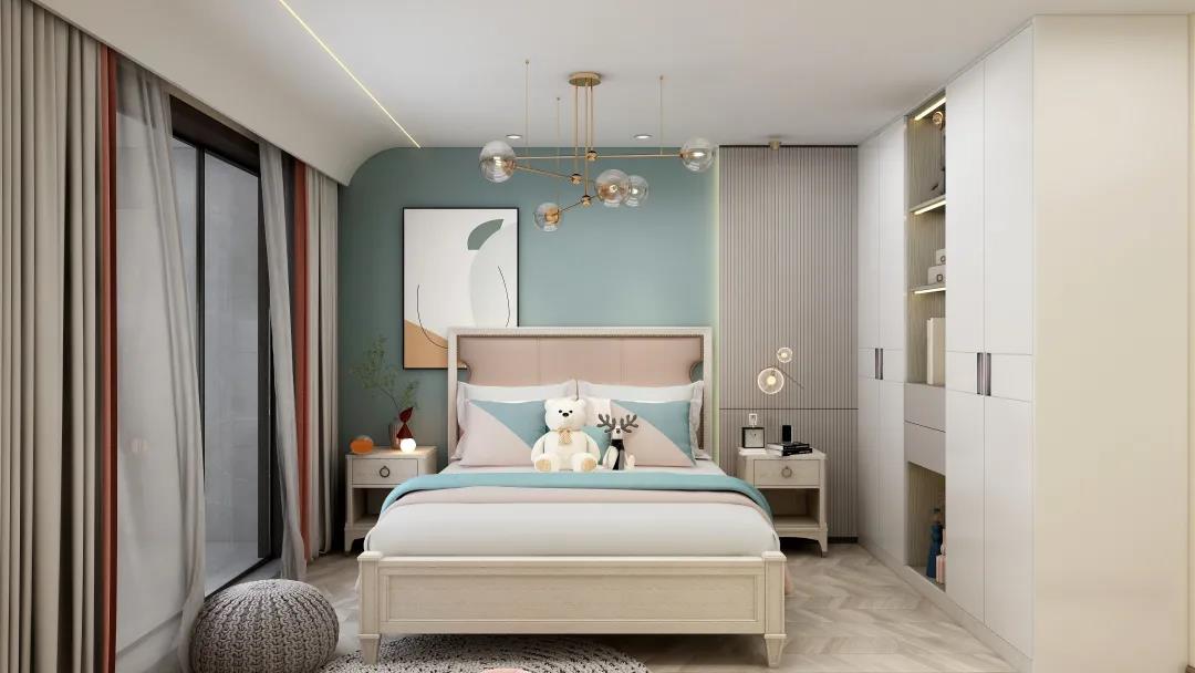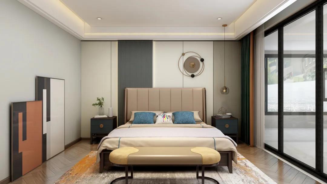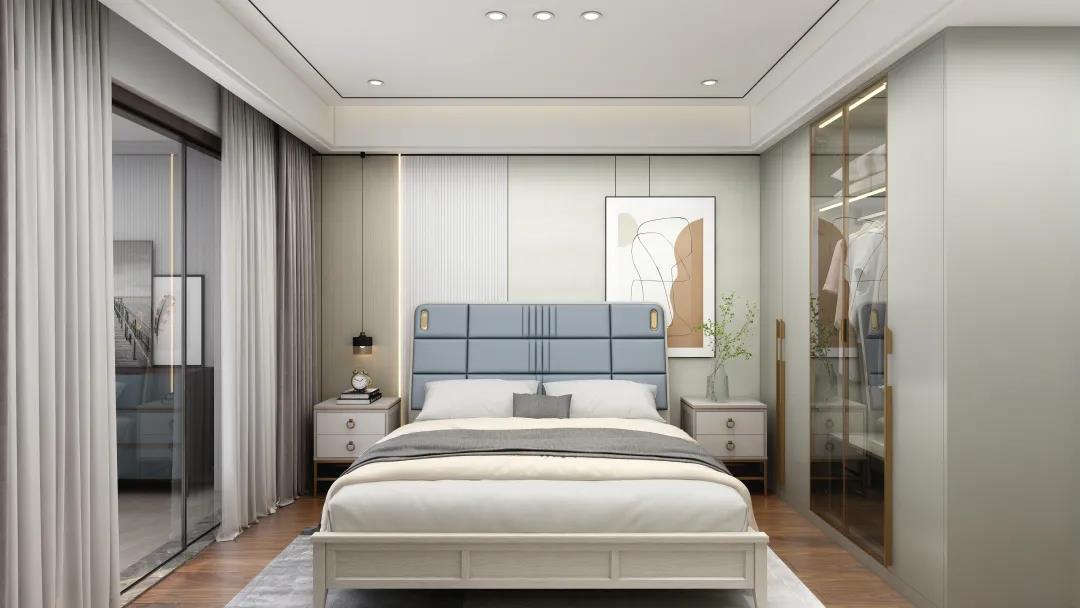 次臥淺灰色的背景墻時尚又內斂,入目盡顯舒適的視覺感,為了避免過于單調,特意搭配了與整體保持一致的拼色窗簾,作為空間色彩的點綴。